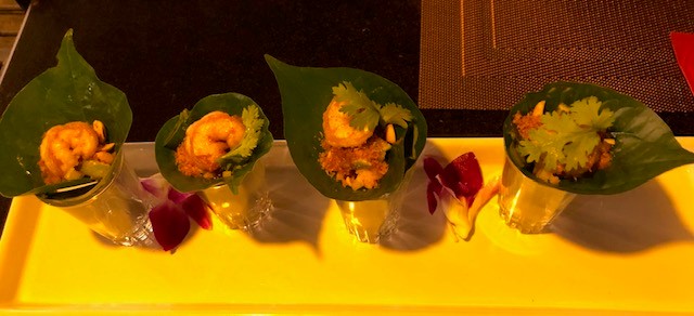 One of our first restaurant experiences was at Paak Dang, a gorgeous teak building and riverside setting providing employment and hospitality training for vulnerable young people. Miang Kham Goong another popular Thai snack was on their list of starters, but I needed a bit of coaching on how to eat it. Many years ago, in Singapore I was served a dish of steamed chicken, wrapped in a pyramid of bamboo leaves. In my ignorance I assumed it was all edible. To a panda, it probably is, but luckily the waitress put me straight before I did myself an injury. The memory of that blunder has never left me, so I tend to approach food wrapped in leaves with trepidation.