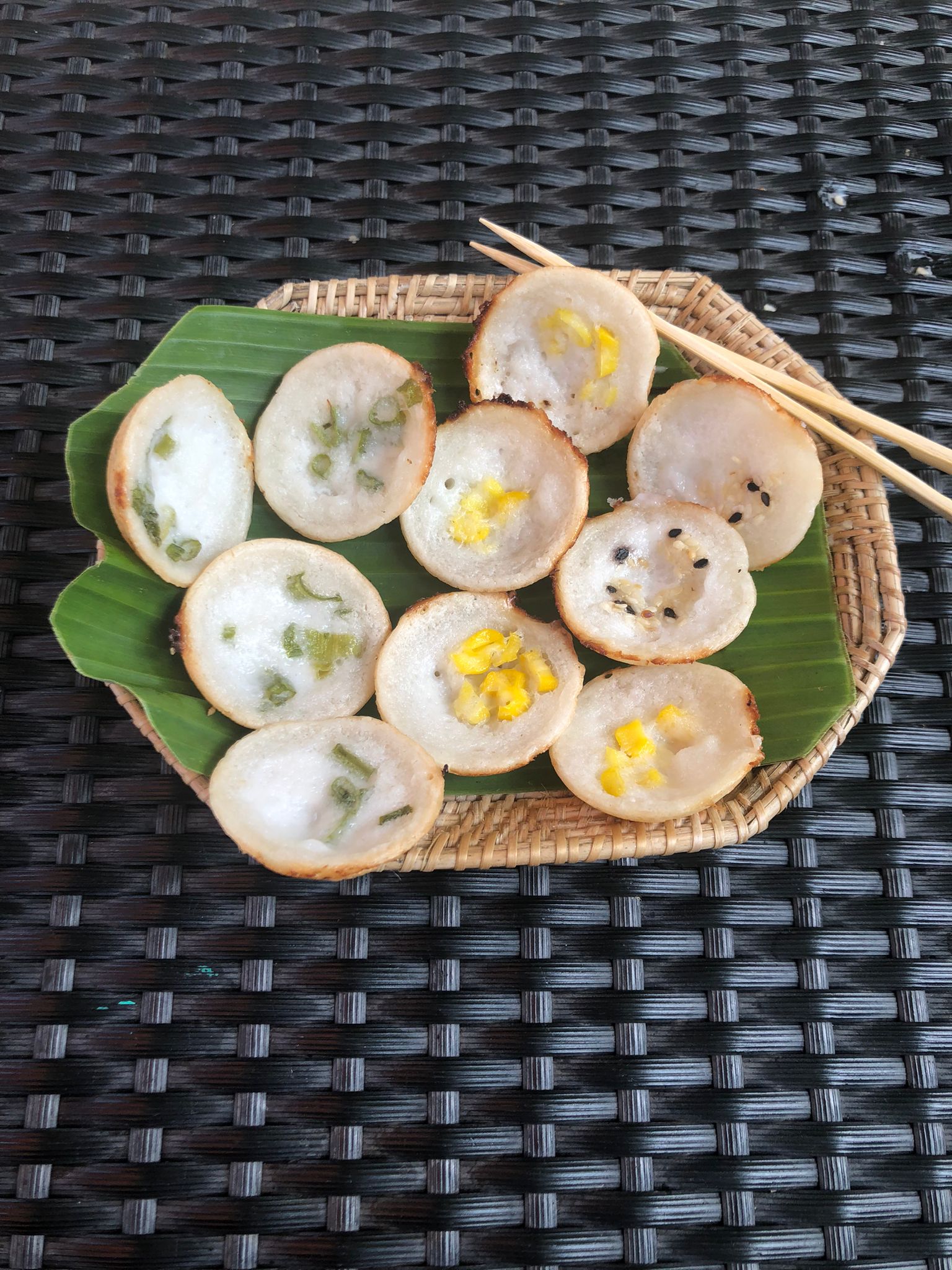 A particular favourite are Kanom Krok – tiny hemi-spherical coconut pancakes, briefly mentioned above. These are cooked in a special pan to create individual crispy shells with a sweet custard-like centre. Finished with more coconut, tiny pieces of corn or green onion, these are a moreish blend of sweet and savoury.