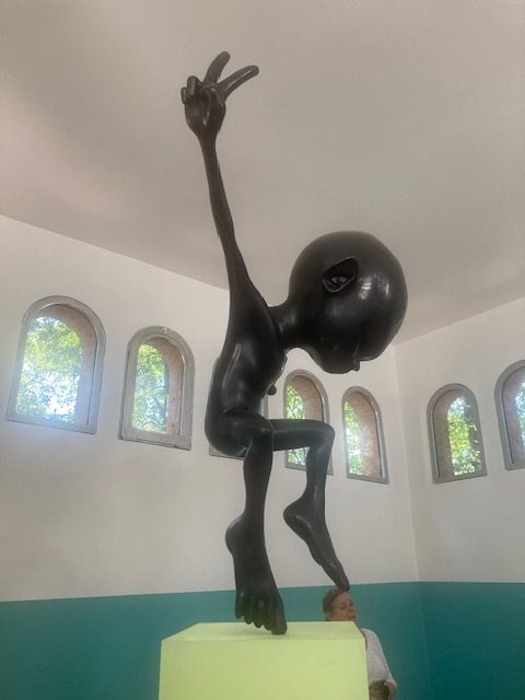 More pertinent to my mind is the artwork that made me consider how we view migrants and refugees who leave their homeland, for whatever reason, in search of the kind of life they think we live. We never consider what it’s like for them to journey through unknown countries and across many borders when everyone they encounter is a foreigner to them! I am thinking particularly of the groups of listless young men I saw gathered in the park opposite Trieste railway station, some with back packs, others with bin liners of possessions at their feet. Waiting for their lives to begin but invisible to passers-by. Or a similar group, static and silent on the steps of Postojna train station in Slovenia. The town has a notorious detention centre for asylum seekers entering the country from Croatia and Bosnia, via the so-called Balkan route. Do they feel disappointed? Disillusioned? Regretful? Lonely?