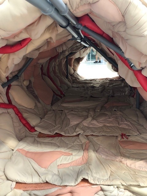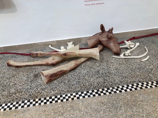 A playful, upholstered tunnel forms the centrepiece of Eva Kotatkova’s artwork for the Czech pavilion and is intriguing, yet impressively clear on the wider questions it poses on the culture of plucking animals from their natural habitat to keep them in captivity. The heart of a giraffe in captivity is twelve kilos lighter tells the story of Lenka, a giraffe captured in Kenya for Prague Zoo in 1954, where she died just two years later.